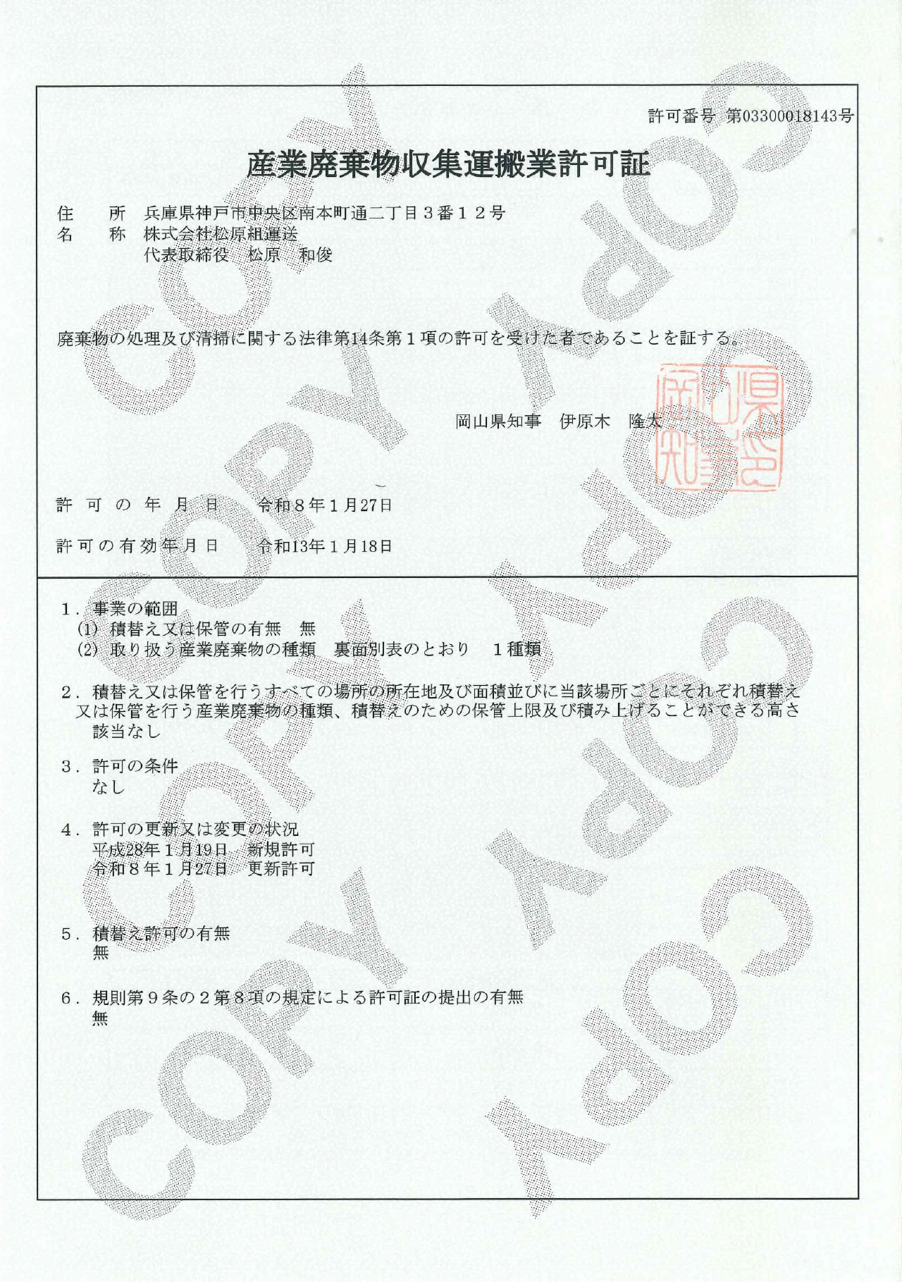 岡山県産業廃棄物収集運搬業許可証令和13年1月18日