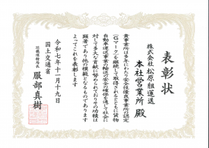 安全・環境・その他の取り組み 株式会社松原組運送は昭和44年の創業以来、地域の皆様とともに歩んで参りました。創業以来変わることなく掲げてきた「安全第一」を基に、これからもチーム一丸となって交通関連法規等を遵守していくことをお約束いたします。また、今日懸念される環境問題におきましても、私たちチームの一人一人が運送事業に従事する者としての自覚を持ち、環境保全の目標意識を高く掲げて取り組んで参ります。 ・国土交通省より多年にわたりGマークを継続して取得していることの功績を認められ、表彰状を頂きました。 ・神戸運輸監理部様よりGマークを継続して取得していることの功績を認められ、表彰状を頂きました。 ・株式会社松原組運送が令和四年度交通安全県民大会において兵庫県知事様より感謝状をいただきました。 ・株式会社松原組運送はエコアクション21の認証を受けています。 エコアクション21とは? 松原組運送の環境活動レポート2023年度分 ・株式会社松原組運送はGマークの認証を受けています。 Gマークとは? ・株式会社松原組運送は一般社団法人兵庫県トラック協会様主催の無事故・無違反運動「チャレンジ100」に参加させていただきました。本年も100日間無事故・無違反で表彰状を戴きました。 ・株式会社松原組運送は優秀安全運転事業所として、自動車安全運転センター様より銀賞をいただきました。 ・株式会社松原組運送 松原グループは三輪運輸工業株式会社様より努力賞をいただきました。 ・株式会社松原組運送が「優良エコドライバーの先駆け」として社団法人兵庫県トラック協会様発行の環境対策広報誌「ROOT」(2011年9月号)に掲載されました。 「ROOT」2011年9月号へジャンプ